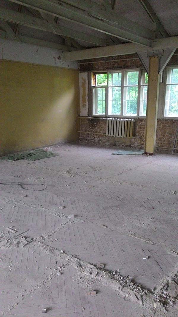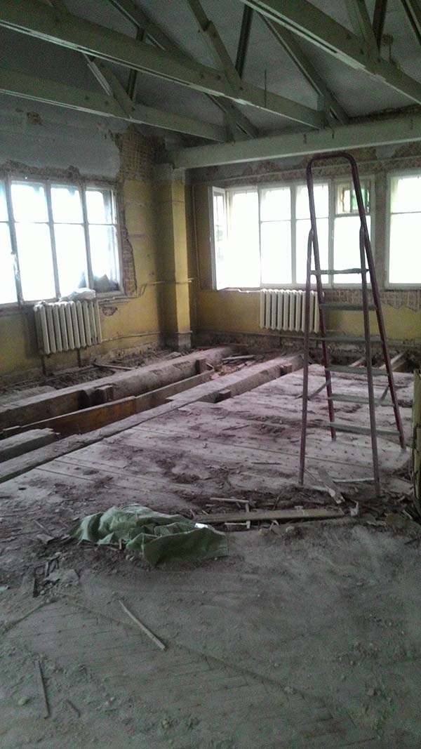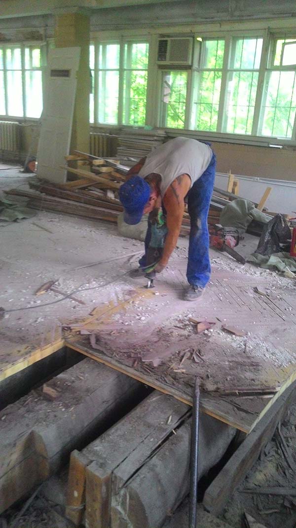 проём аккуратно вырезан, разделён на подъёмные части, усилен швеллером и подготовлен под дальнейшие работы.